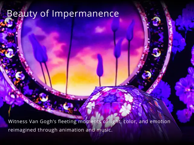 A tribute beyond time. Experience Van Gogh’s beauty, impermanence, and rebirth in immersive motion.