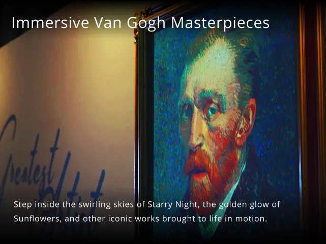 1. Immersive Van Gogh Masterpieces — Step inside the swirling skies of Starry Night, the golden glow of Sunflowers, and other iconic works brought to life in motion.
