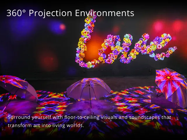 2. 360° Projection Environments — Surround yourself with floor-to-ceiling visuals and soundscapes that transform art into living worlds.