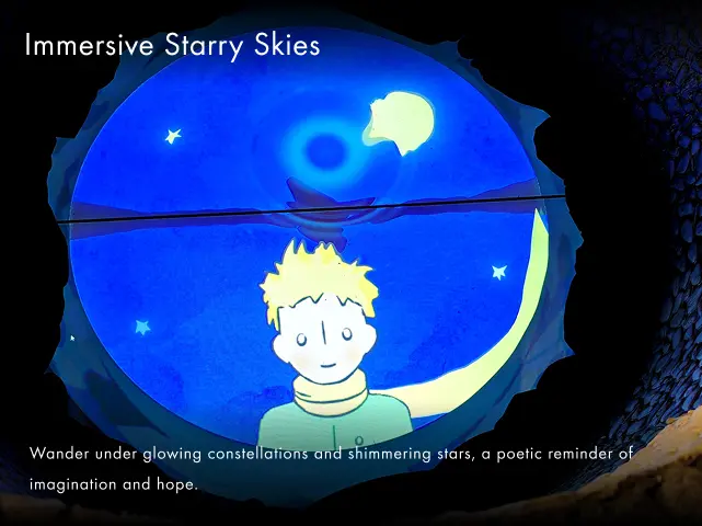 - A Storybook Brought to Life — Enter a giant digital book that flips as you move, opening the gateway to the Little Prince’s magical universe.